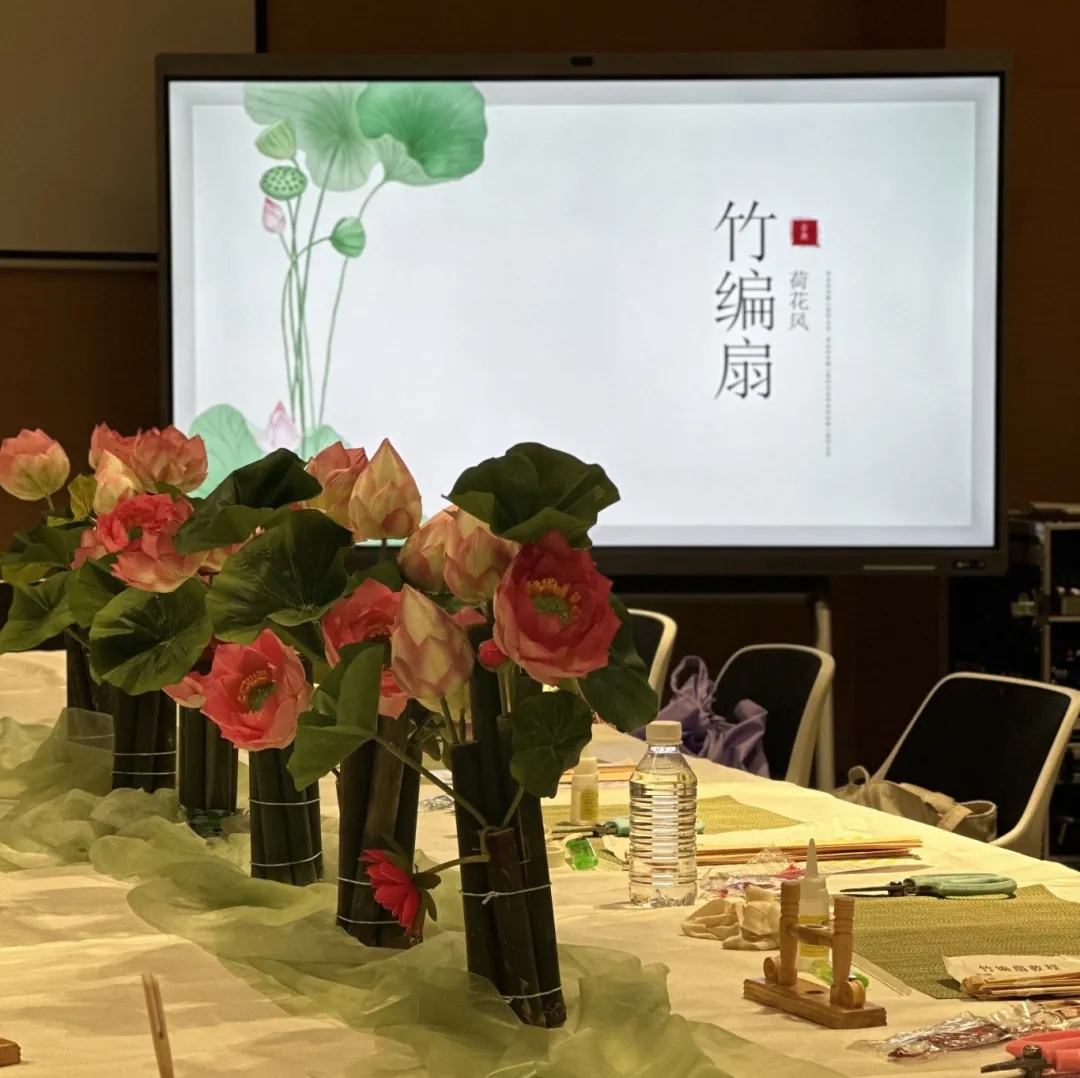 随后便是许小莲老师作为今天带队的老师,针对今天的主要活动进行讲解。竹编扇是一种传统的手工艺品,它结合了中国的竹编工艺和扇子文化,具有悠久的历史和深厚的文化底蕴,通常选用质地坚韧、纹理细腻的竹子。活动中所使用的每一片竹篾,都是许老师亲赴老家,亲手砍伐、精心劈制,并亲自携带至活动现场的。