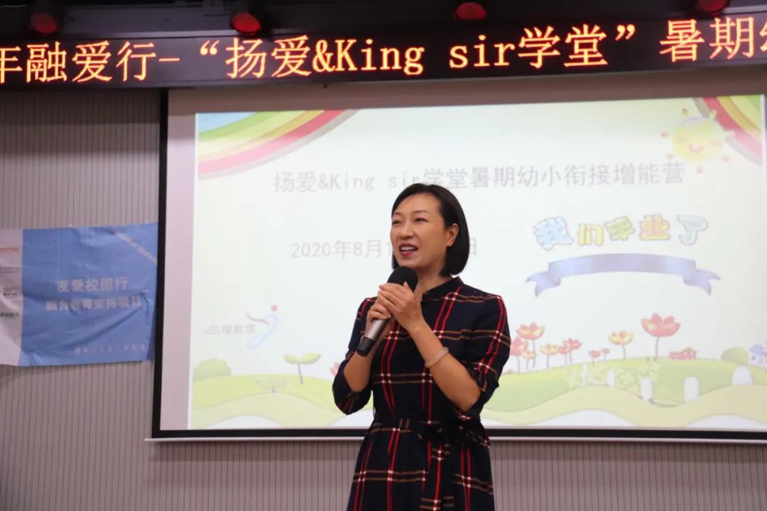 8月21日下午,在白云区龙兴小学的大礼堂里,2020年度融爱行——“扬爱&King sir学堂”暑期幼小衔接增能营迎来了孩子们的“毕业典礼”。广州扬爱理事长戴榕女士、理事胡风女士、广州市白云区龙兴小学曹海飞校长和广州市杰鋭偲教育咨询有限公司刘劲老师参与了结营仪式。